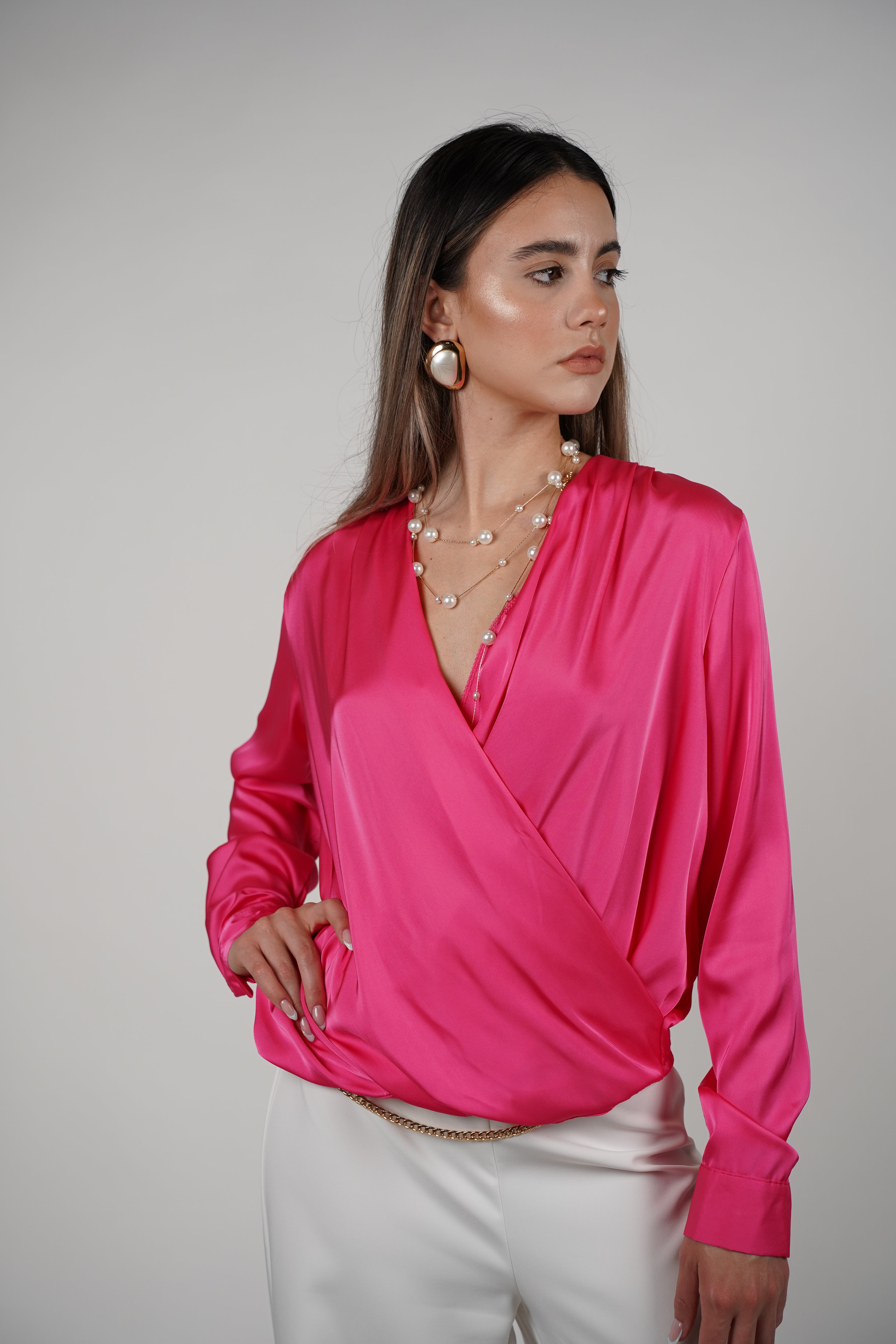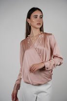 Model wearing a silky blush pink wrap-style blouse with long sleeves and pearl necklace, paired with white trousers.