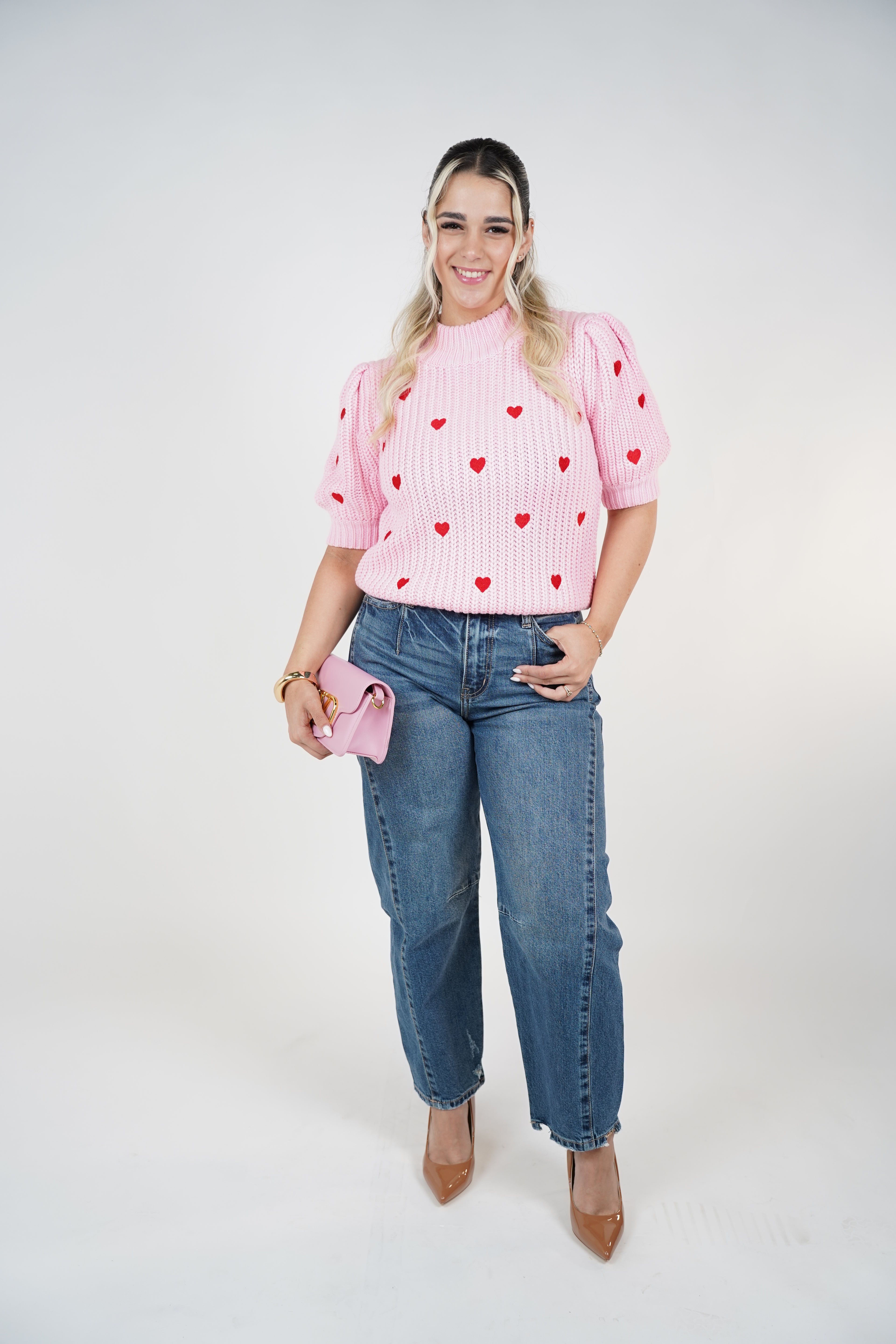 A cozy knit sweater designed with a playful heart pattern and a soft, feminine feel.