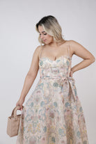 Pastel floral sweetheart neckline maxi dress with flowing skirt and side waist tie detail styled with nude mini handbag.