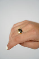 Close-up of the Kimi Ring worn on the index finger, showcasing a thick dome design with a polished gold finish.