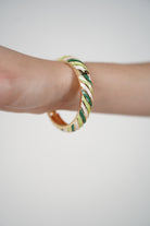 A chunky striped enamel bangle in green, ivory, and gold tones—also available in other color options.