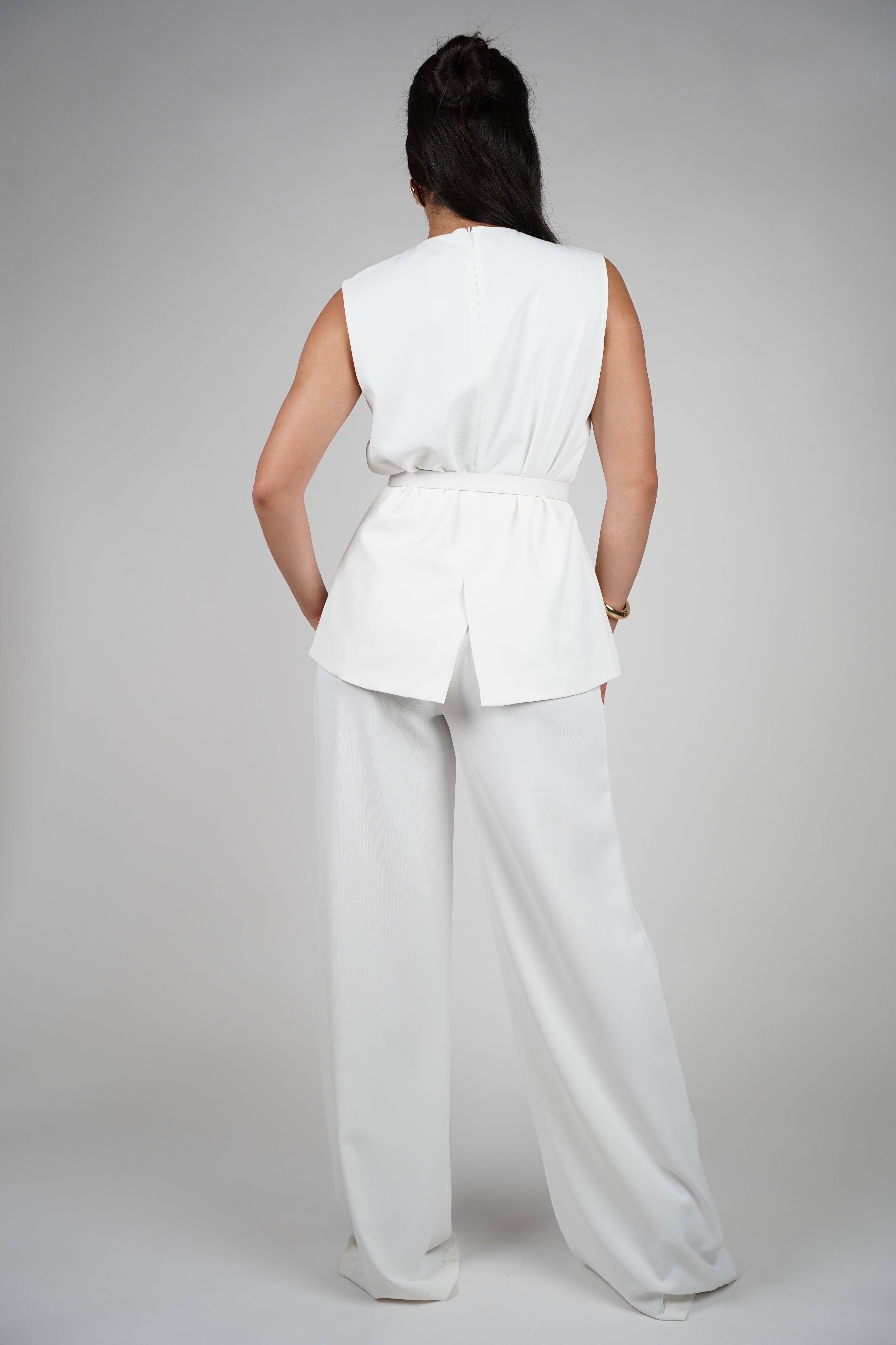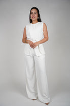 Alt text: Woman wearing an ivory sleeveless belted top and wide-leg pants set, posing confidently.