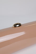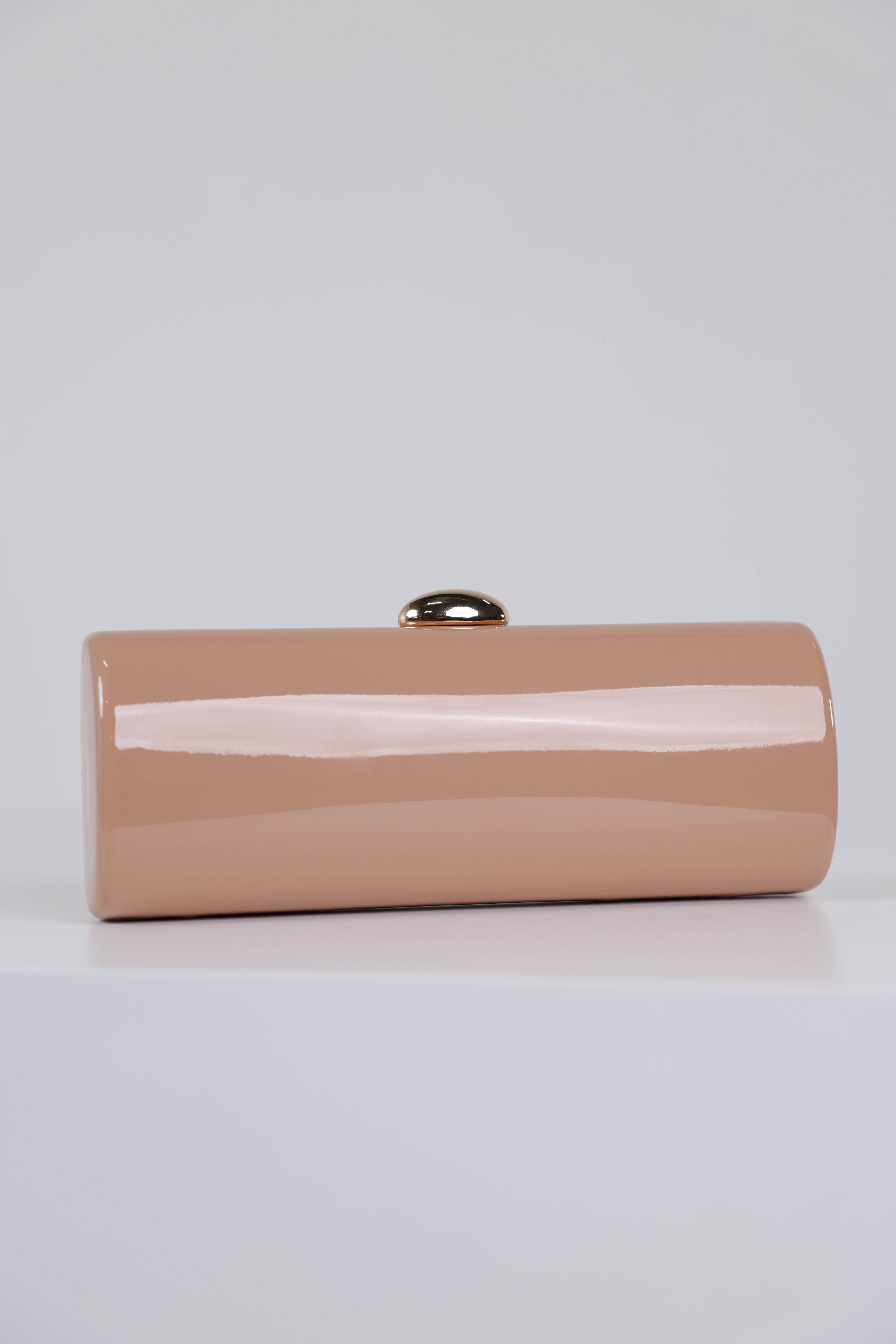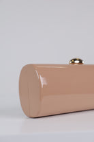 Glossy nude cylindrical hard-case clutch with metallic top clasp and smooth lacquered finish displayed on white pedestal.