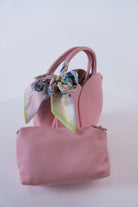 Blush pink structured bucket bag with top handle, pebbled texture, removable inner pouch, and silk scarf accent on a neutral background.