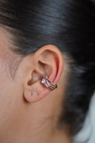 Ear cuff shown styled solo with hair pulled back to showcase its sparkle and design.
