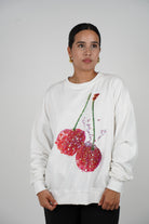 This cozy sweater features a bold cherry graphic adorned with rhinestones and a sparkling bow, bringing playful charm to your wardrobe.