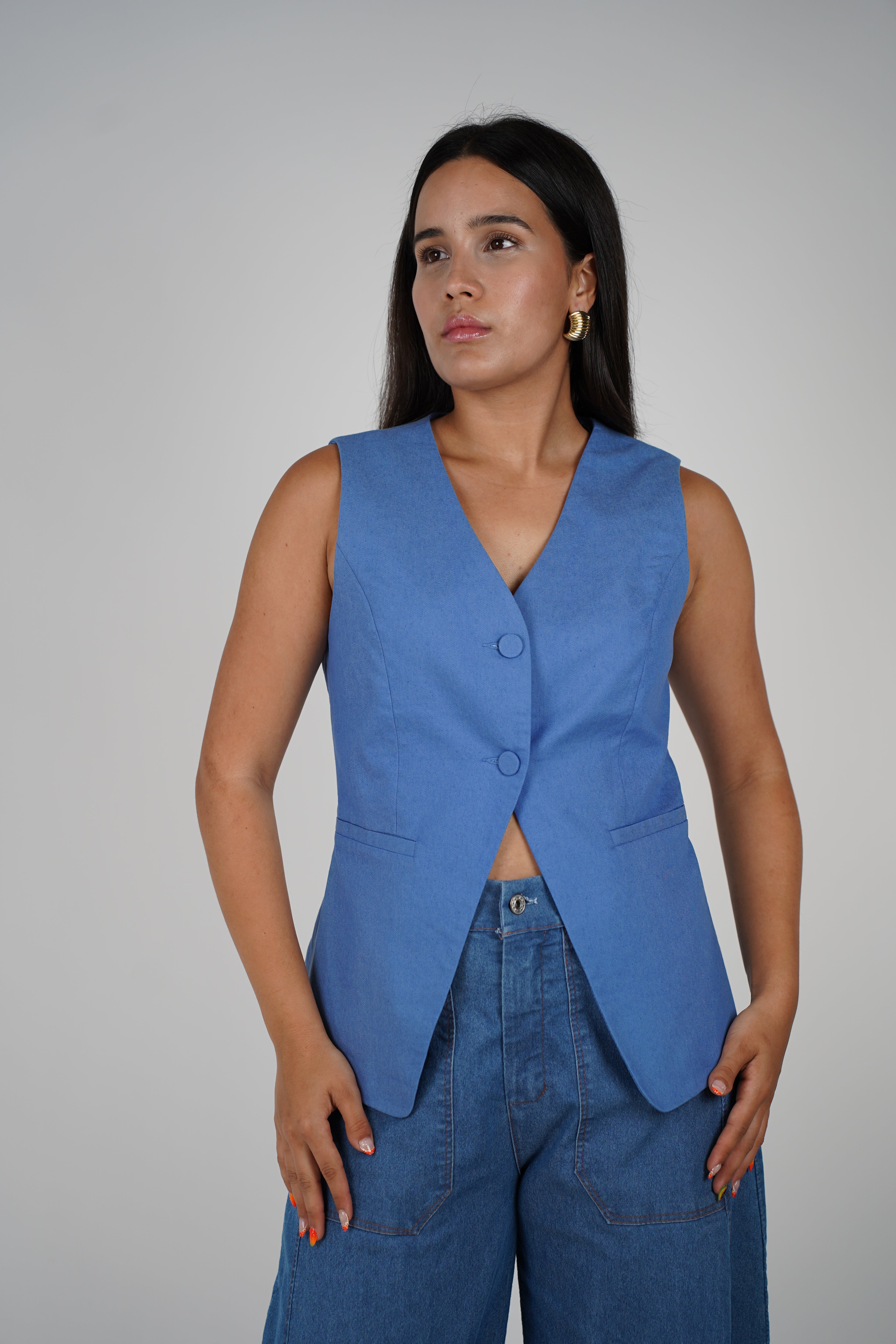 Model wearing a sleeveless blue linen vest with covered buttons and denim wide-leg pants.