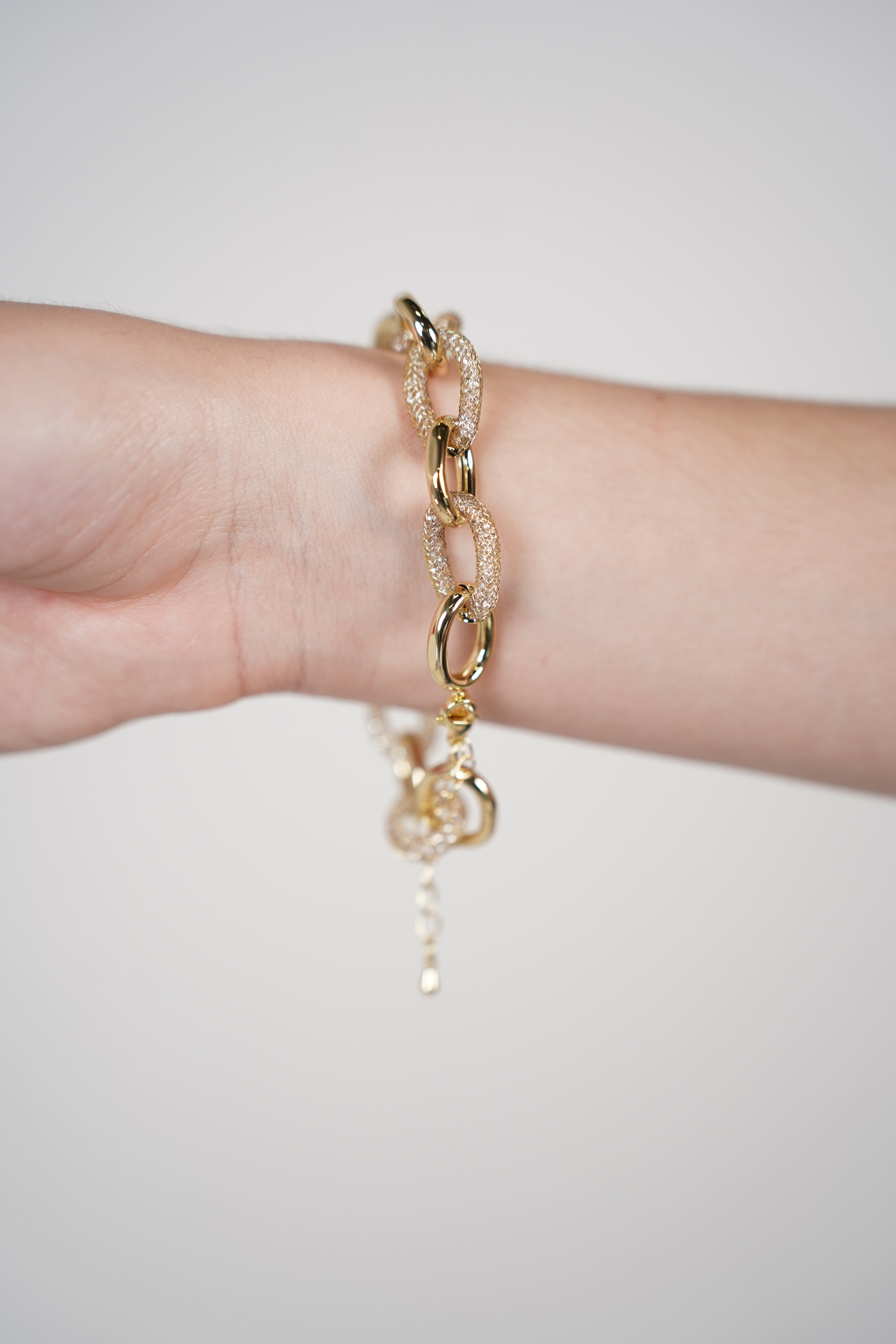 Close-up of Loxa Bracelet featuring alternating gold textured and polished links on wrist.