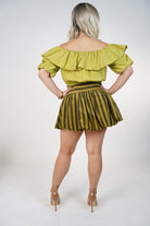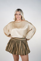 Woman wearing a striped mini bubble skirt with elastic waistband styled with a satin blouse