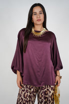 The Luma Satin Blouse brings together modern ease and timeless sophistication. Cut from a silky plum-tone fabric, this flowy piece features relaxed balloon sleeves that taper at the cuff for an effortlessly chic silhouette. The drop shoulders and loose fit offer breathability and style in equal measure, while the glossy finish elevates any outfit. Whether paired with printed pants for a bold look or tucked into tailored bottoms for polish, the Luma blouse is a versatile piece that transitions seamlessly from day to night.