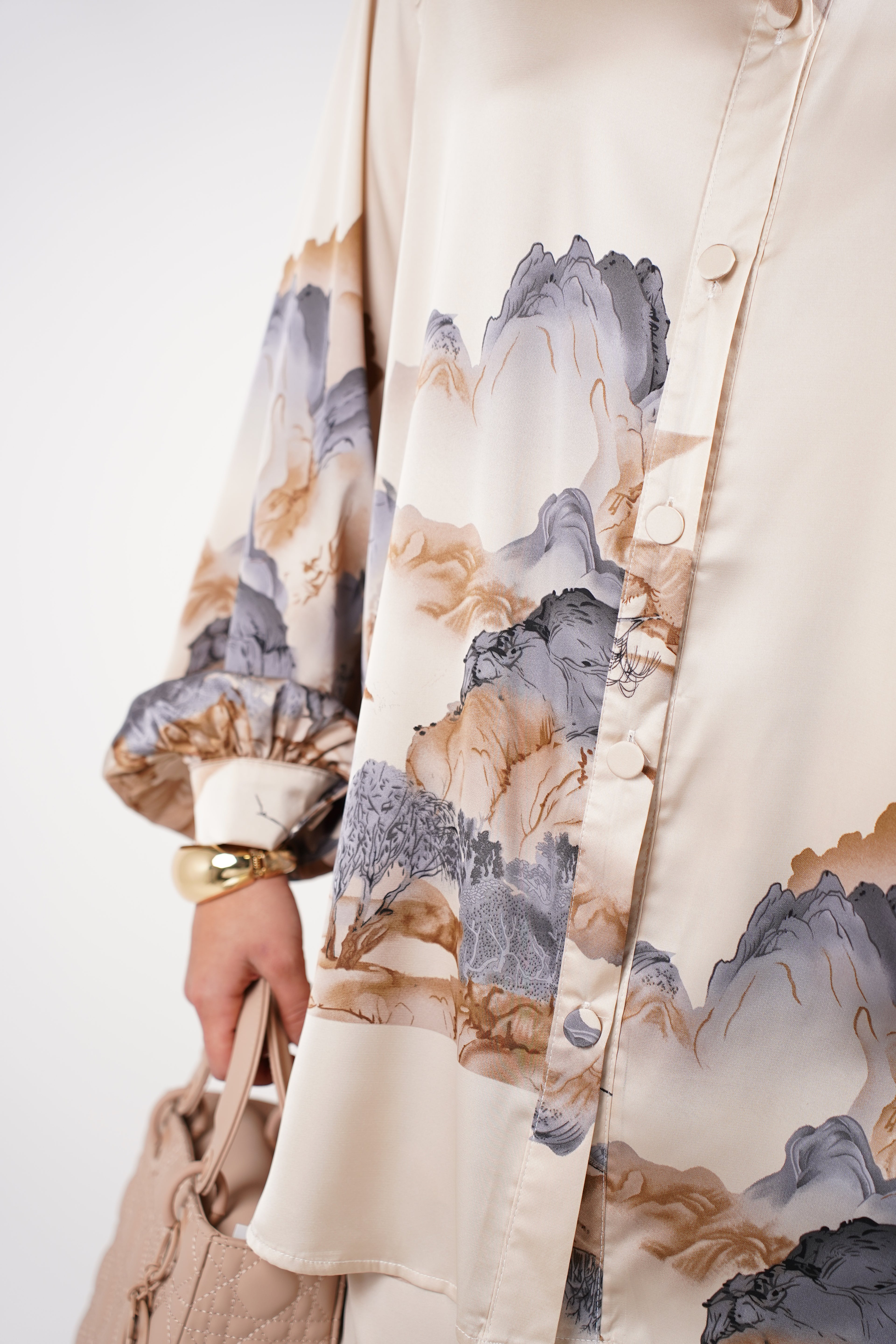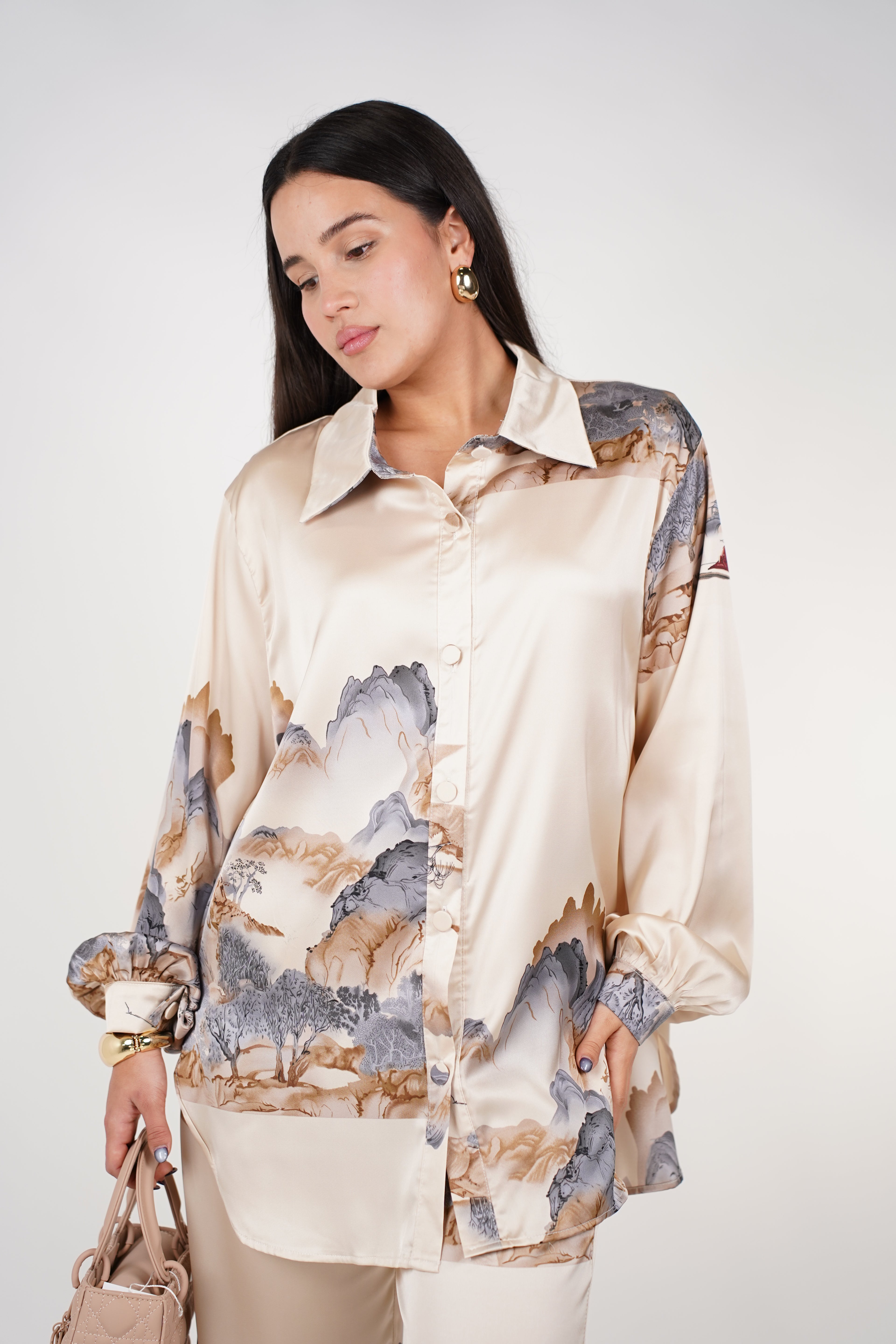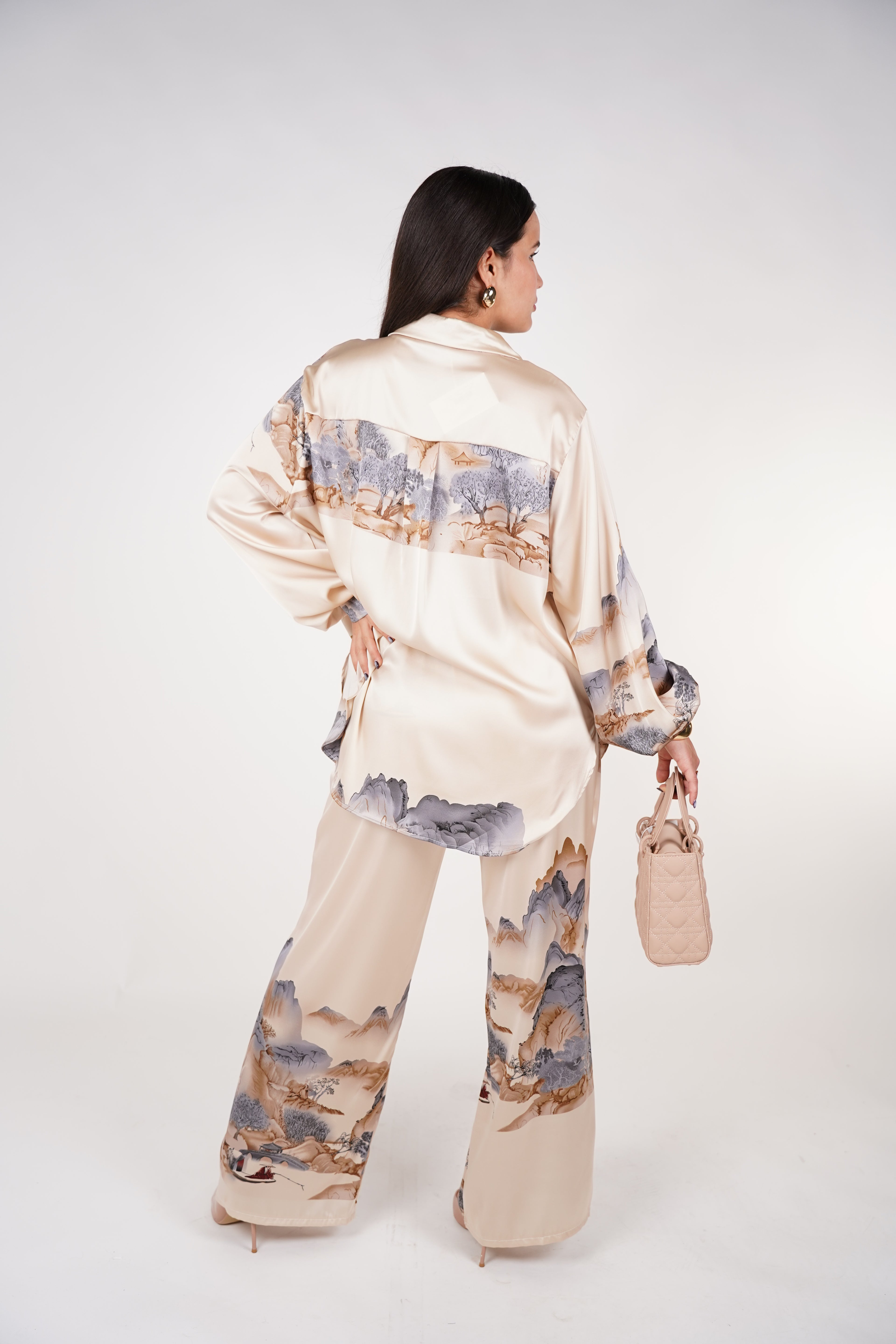 “Woman wearing silky stamped landscape print pants set in beige and gray tones – oversized top and wide-leg pants.”