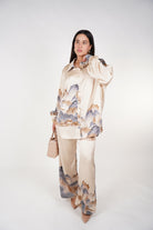 Lunare Stamped Pants Set – Satin Printed Two-Piece Outfit | Carema Boutique