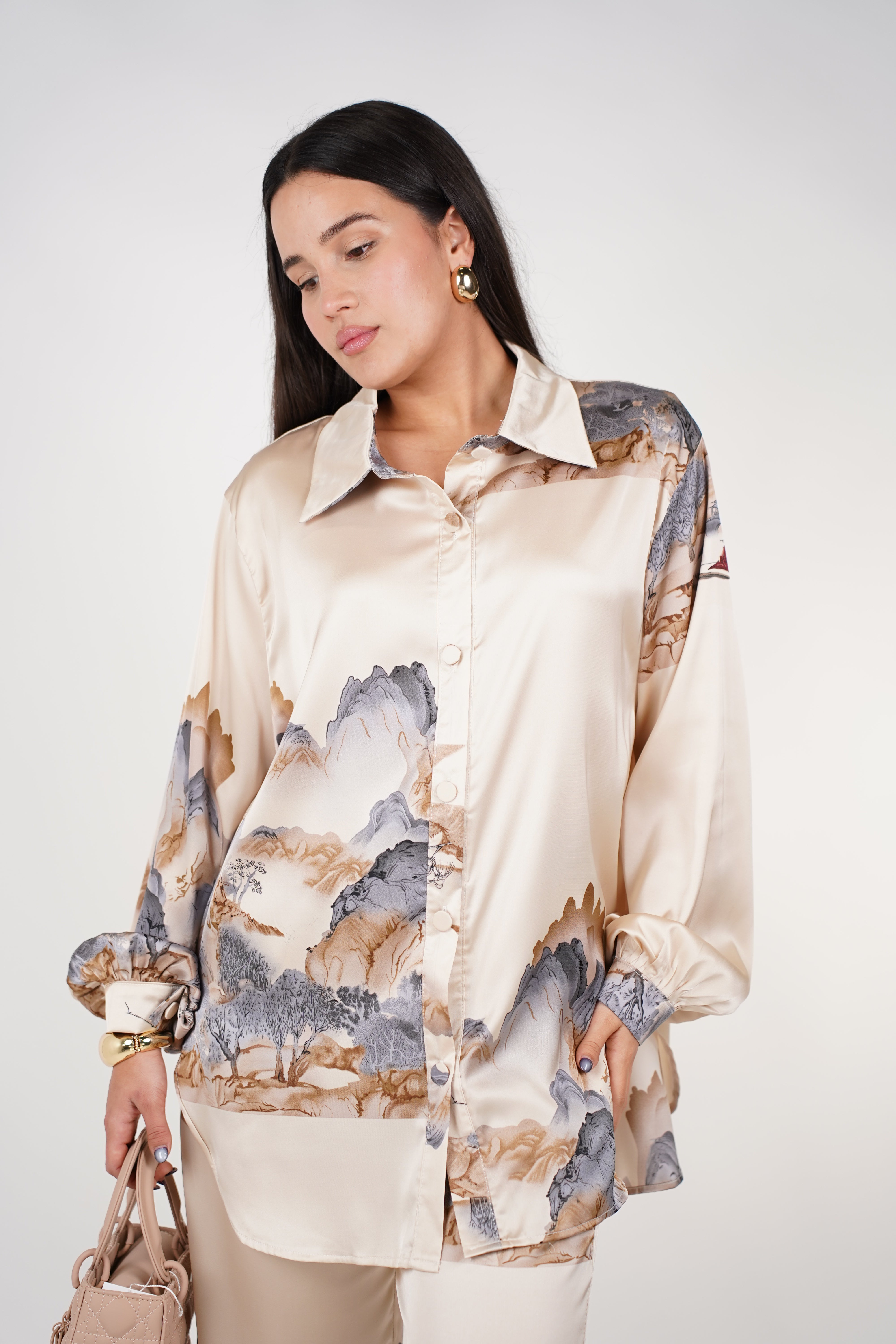 The Lunare Stamped Pants Set brings an elegant and artistic touch to your wardrobe. Crafted from smooth satin with a landscape-inspired print, this set blends comfort and sophistication seamlessly. The button-down top offers an oversized, relaxed silhouette with a beautiful drape, while the matching wide-leg pants create a fluid, elongated look.
