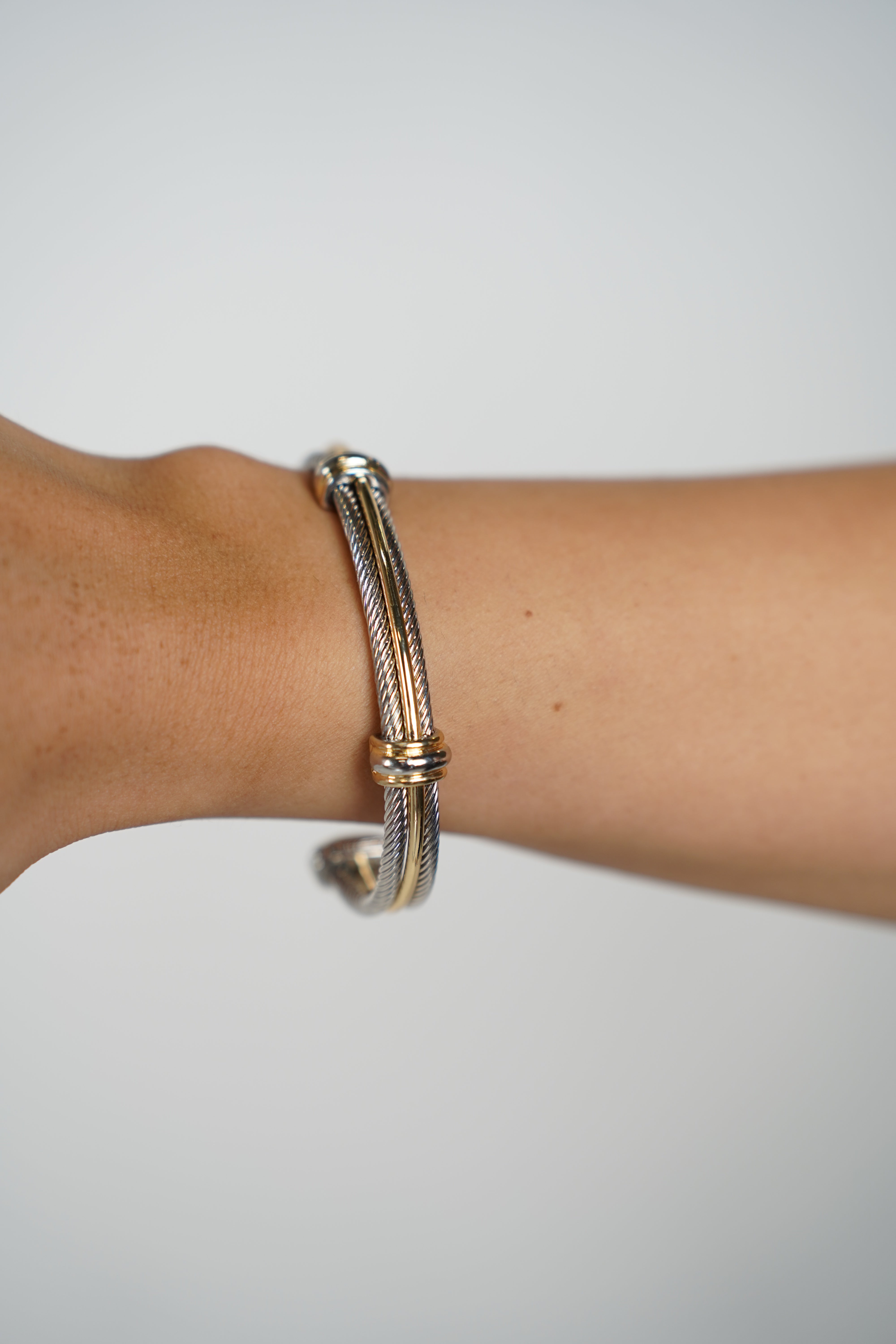 Two-tone cable cuff design in silver and gold