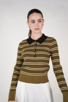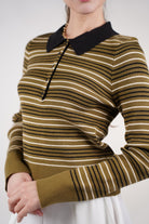 Shop the Lunora Stripped Polo Sweater featuring ribbed knit texture, warm olive stripes, and a contrast black collar. A chic wardrobe essential for cool-weather styling.