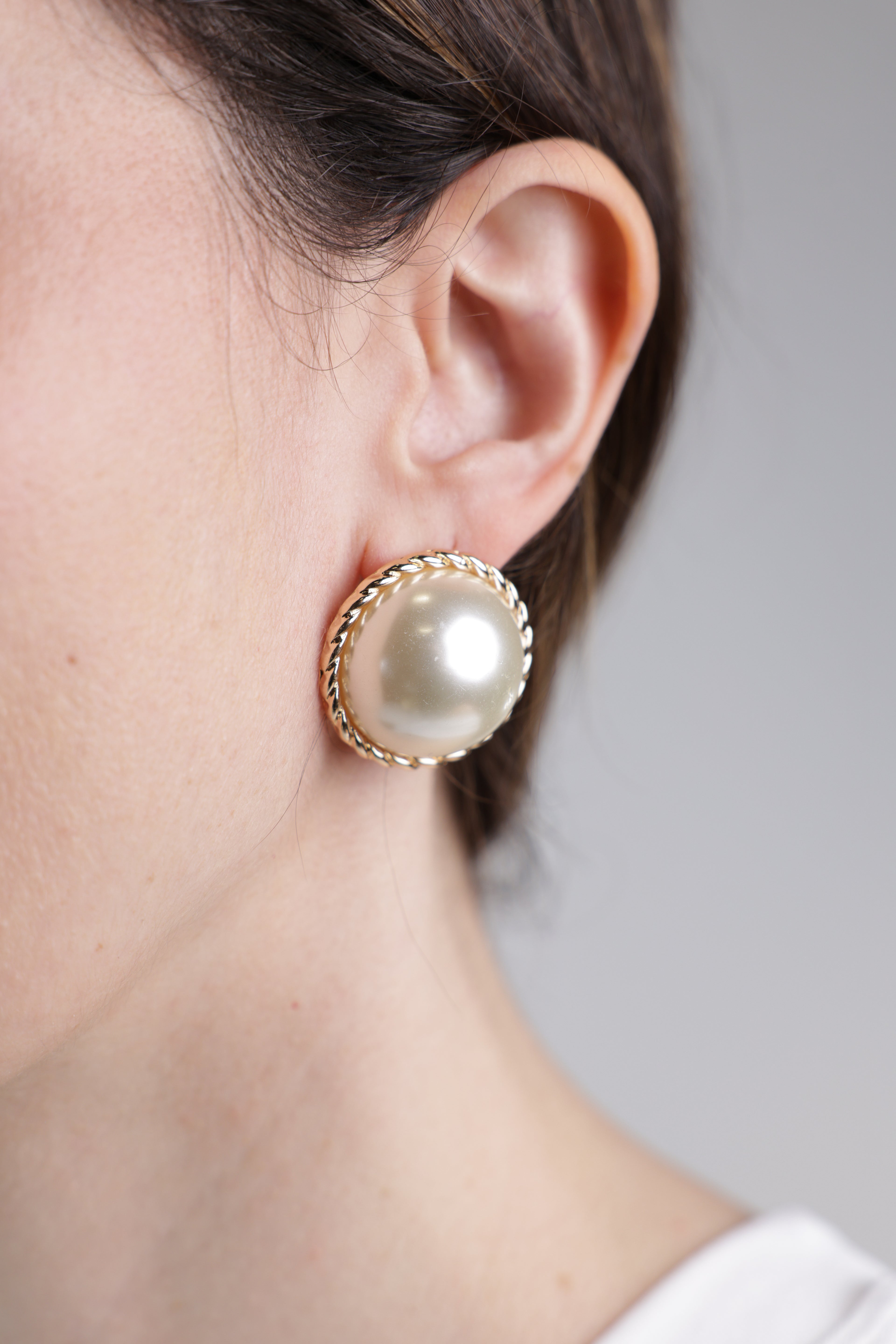 Oversized pearl stud earrings with twisted gold rope frame and domed center pearl worn on ear.