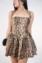 Shop the Luxevi Leopard Mini Dress featuring a fierce halter neckline, structured bodice, and flared mini skirt. A bold statement dress perfect for special occasions.