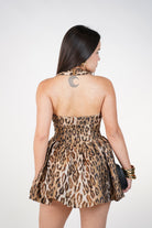 Luxevi Leopard Mini Dress with halter neckline, fitted bodice, and flared skirt in bold leopard print