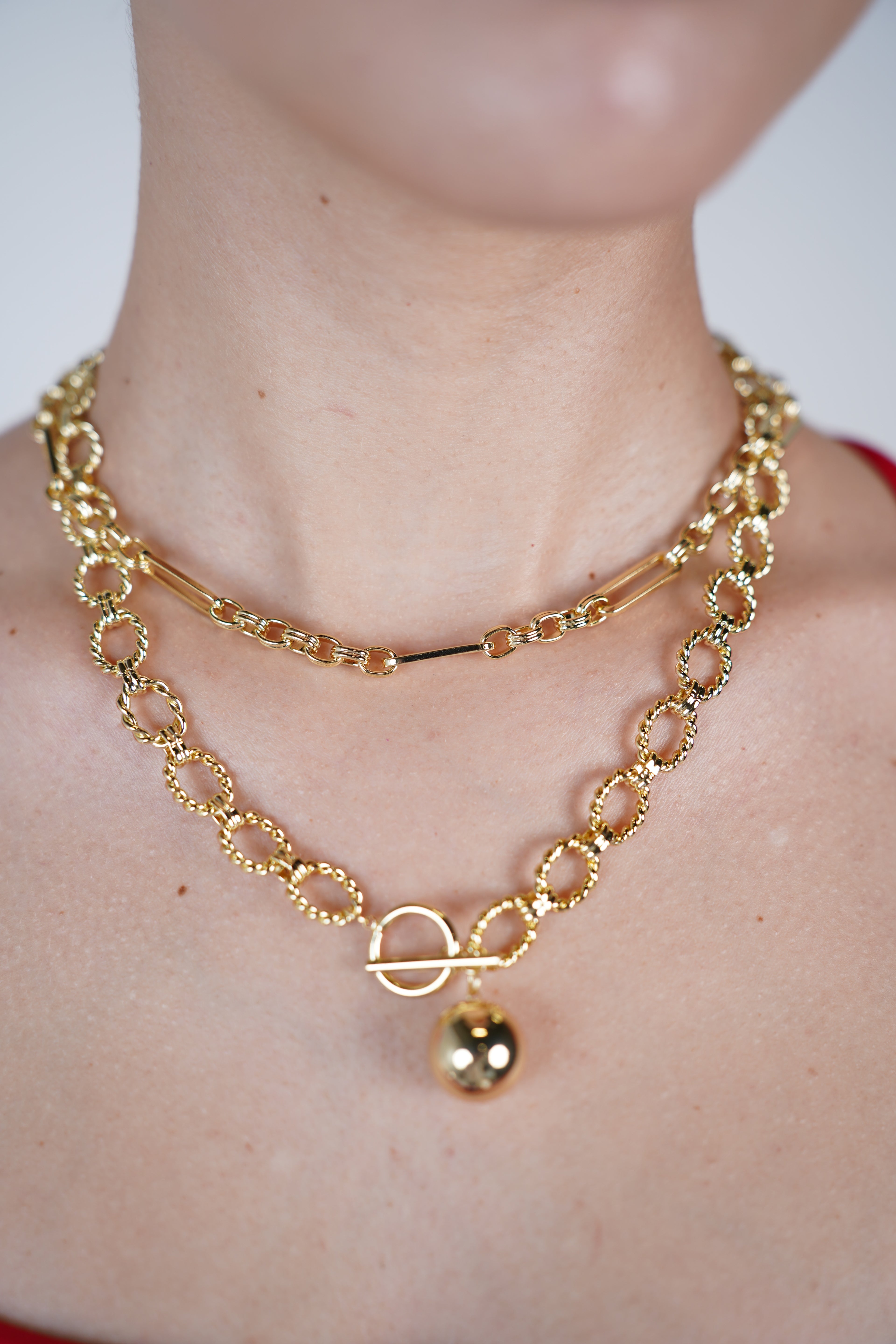 Close-up of textured gold chain necklace with a gold ball pendant on model’s neck.