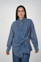 Meet your new favorite statement denim top. The Lyna Denim Button Down takes a classic silhouette and elevates it with an asymmetric wrap design and gathered front detailing, anchored by an embellished jewel accent for a touch of glam. Its relaxed yet sculpted fit drapes effortlessly over the body, making it perfect for dressing up or down. Pair with jeans for a chic denim-on-denim moment or style with tailored bottoms for a polished edge.