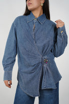Lyna Denim Button Down | Asymmetric Jewel Accent Denim Top