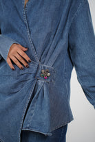Elevate your denim game with the Lyna Denim Button Down — featuring an asymmetric wrap design and jeweled detail for effortless chic styling.