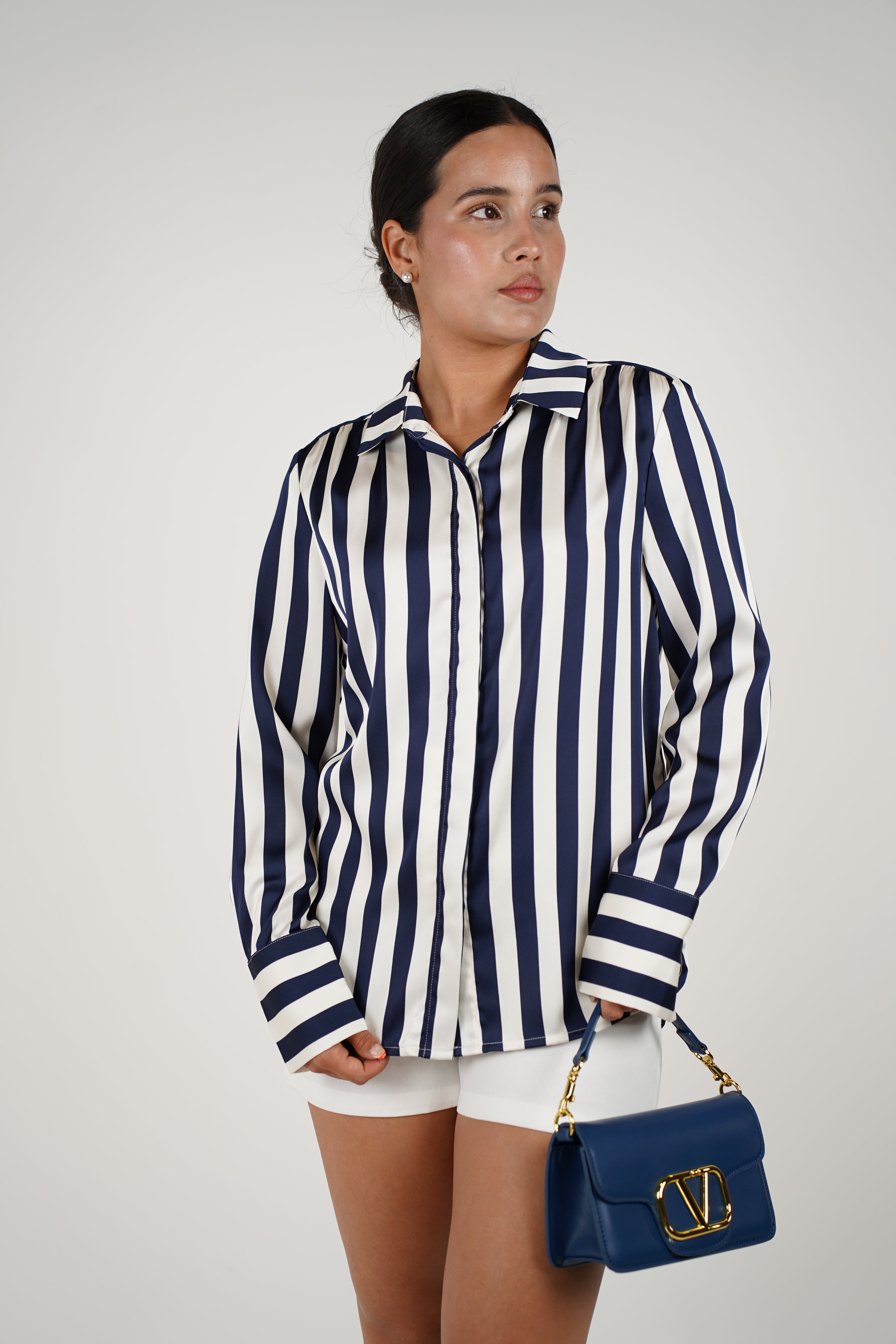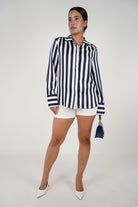Meta Description: The Mari Button Down is a luxe silk shirt featuring timeless navy and white stripes. Elegant, versatile, and perfect for every occasion.