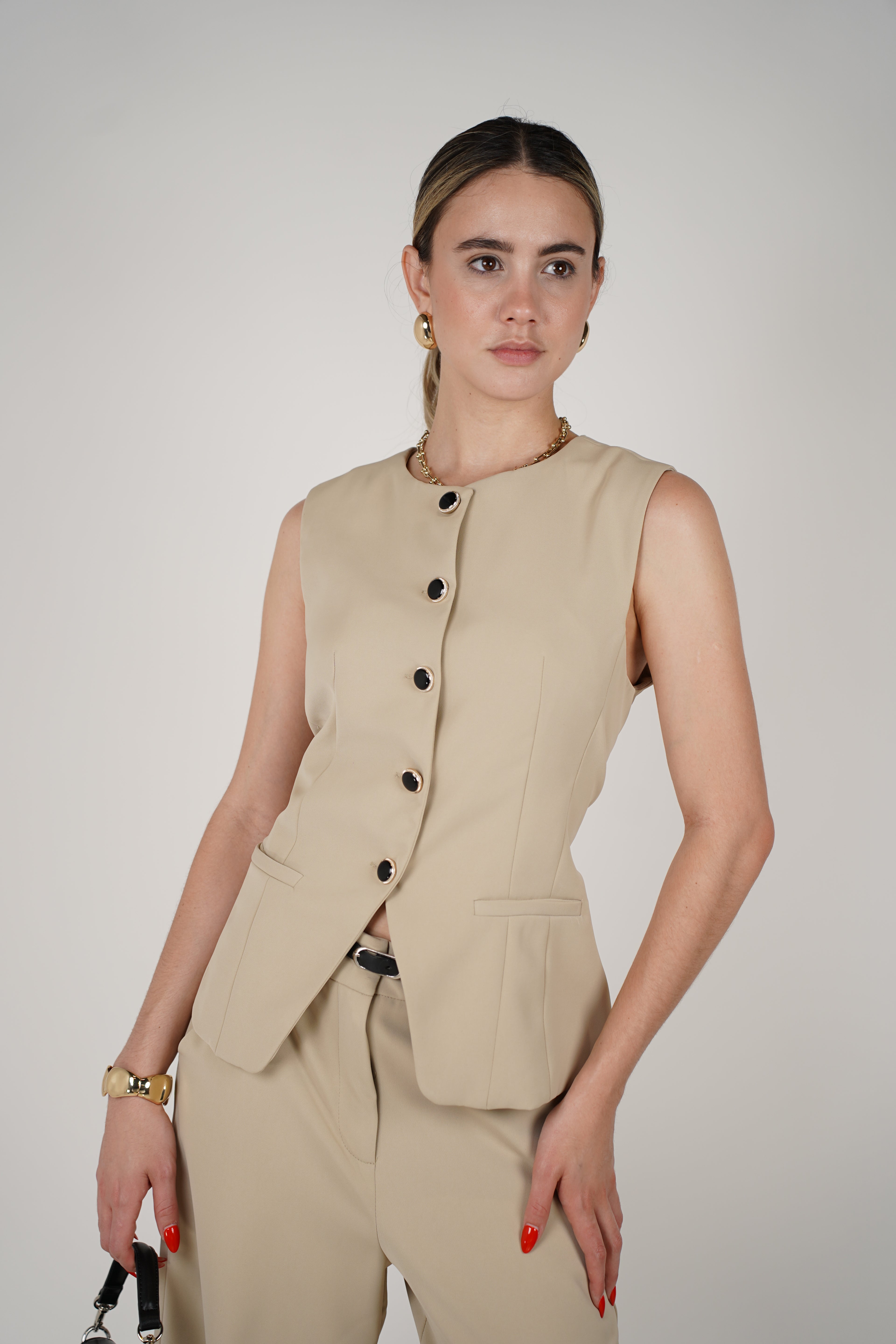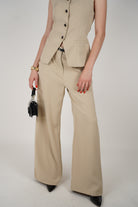 Beige two-piece pants set featuring a sleeveless button-up blazer and matching wide-leg trousers for a structured, chic look.