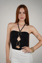 Meta Title: Maria Gold Emblem Top – One Size Statement Halter | Carema Boutique