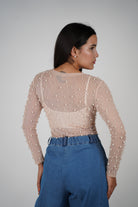 Model wearing a sheer nude mesh long sleeve top embellished with pearls and rhinestones.