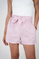 Meta Description: Shop the Meliza Striped Bow Shorts featuring a paperbag waist, pink and white stripes, and a flirty bow. A must-have for summer styling.