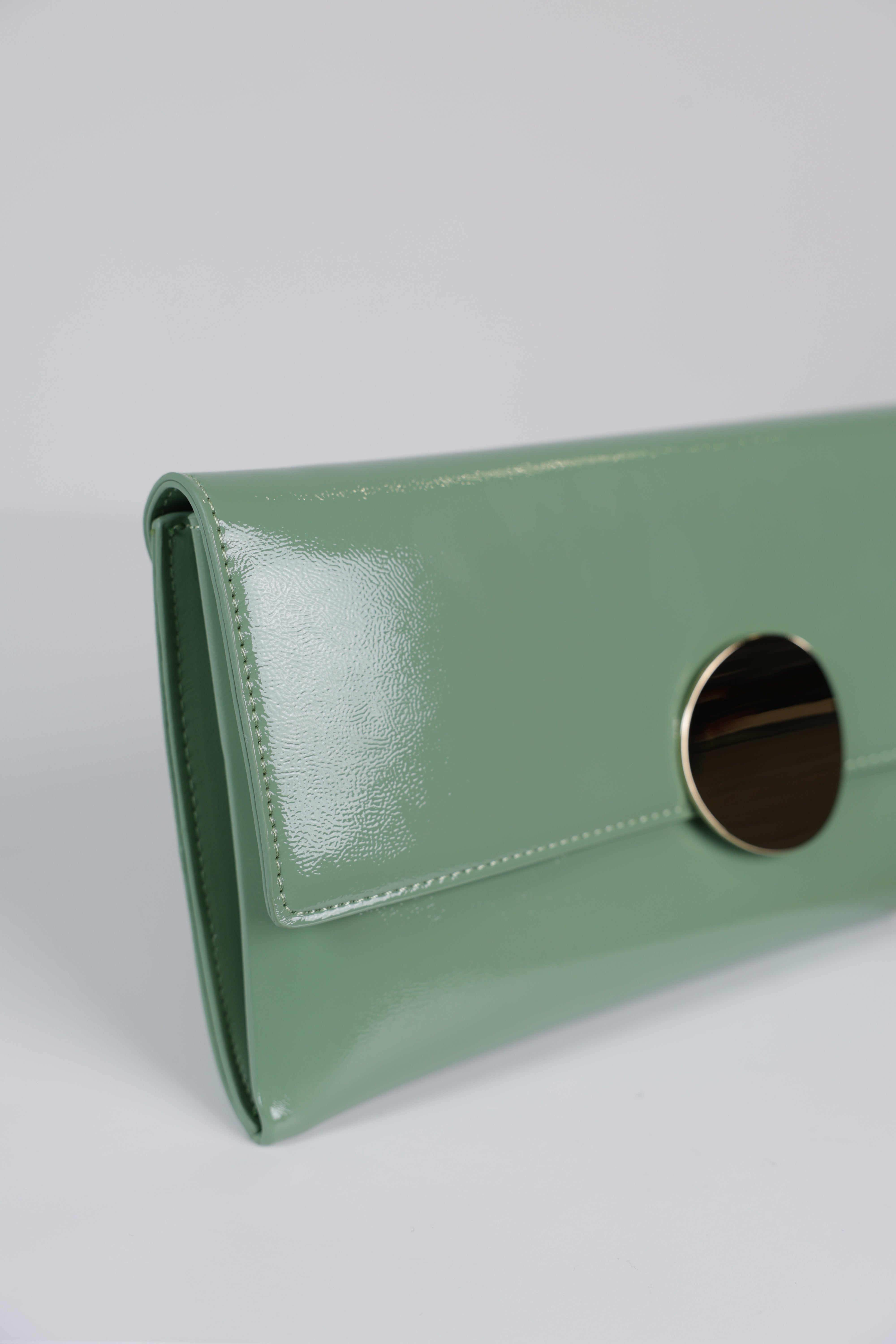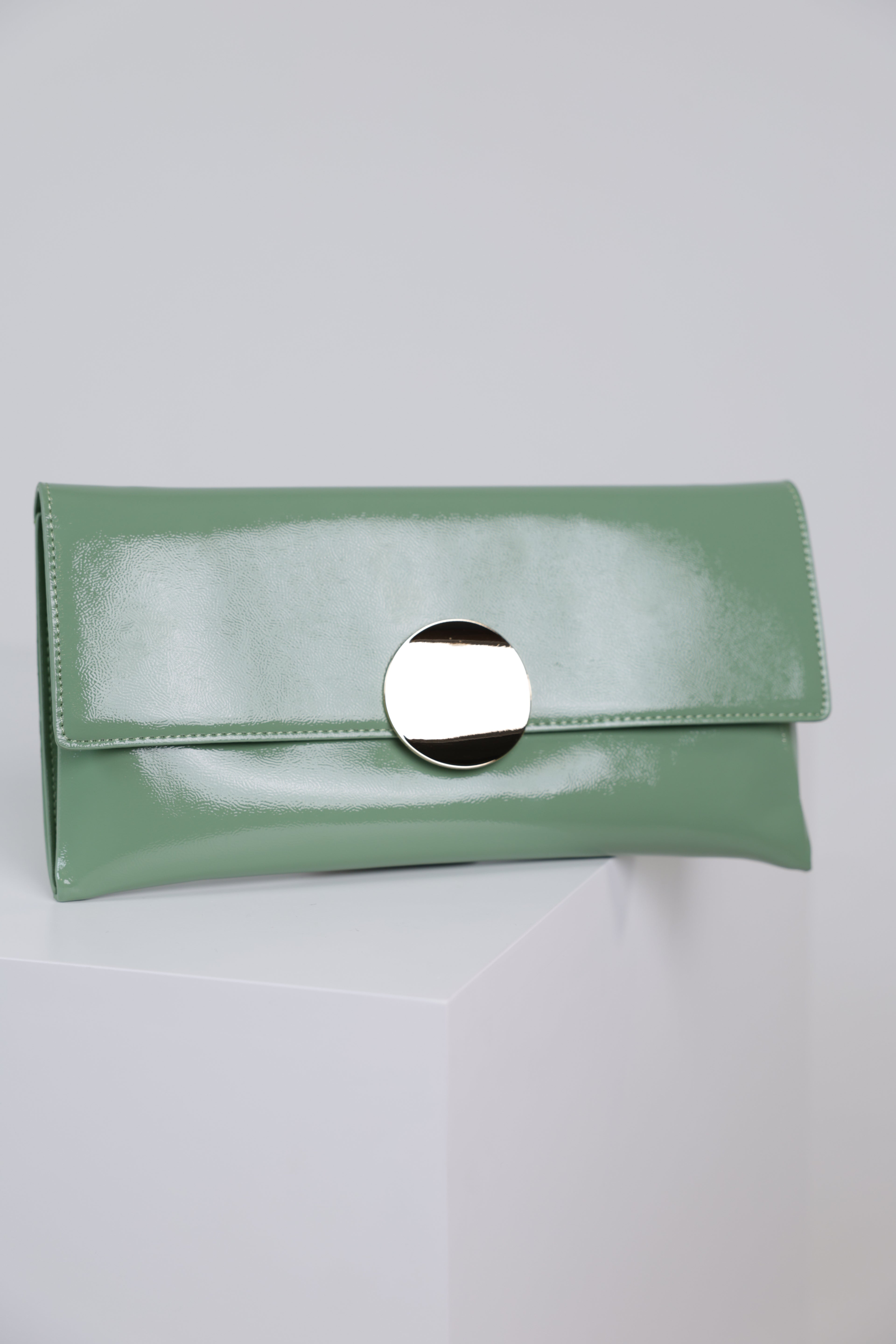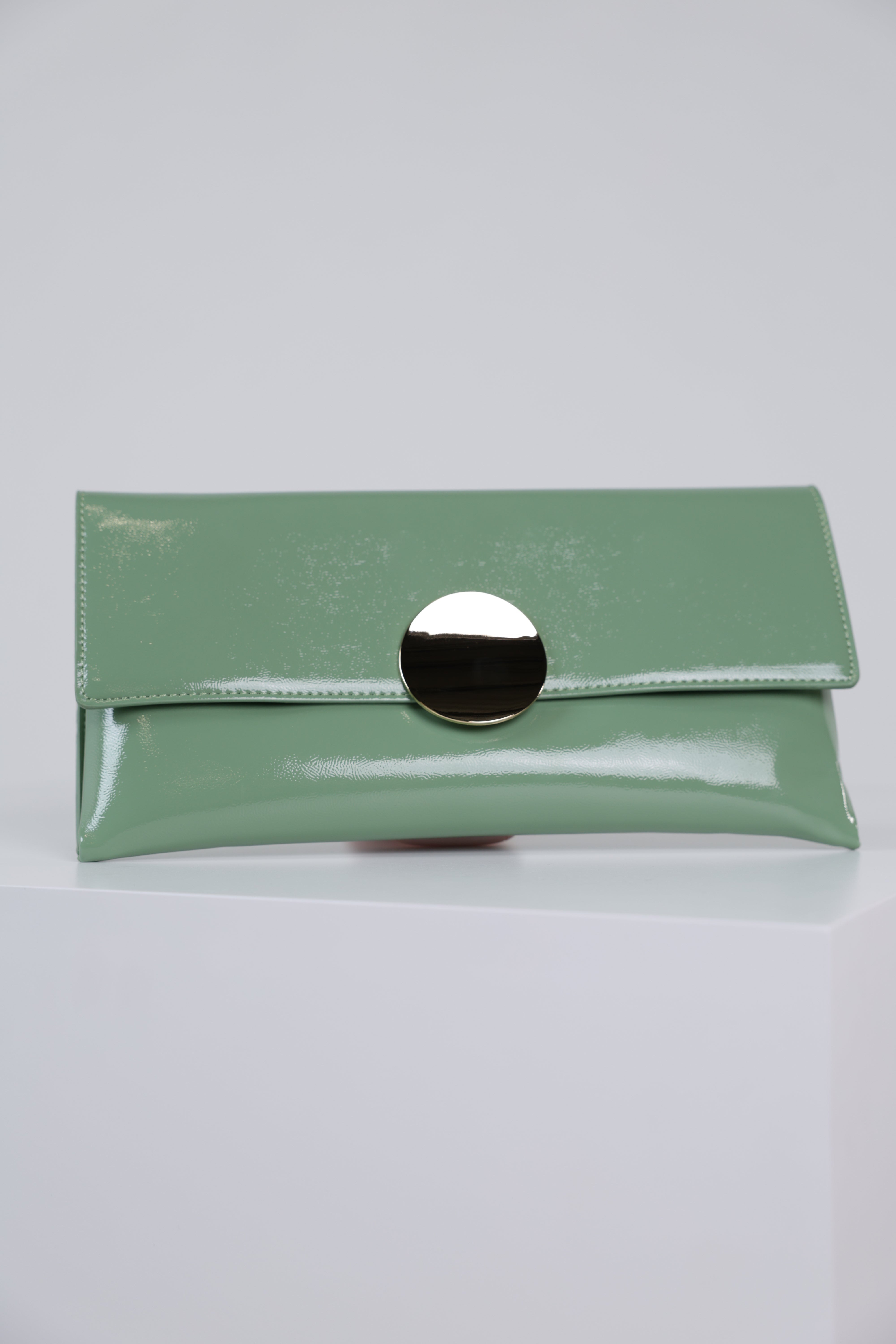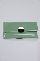 Glossy mint green patent clutch with oversized round gold clasp and envelope silhouette displayed on white pedestal.