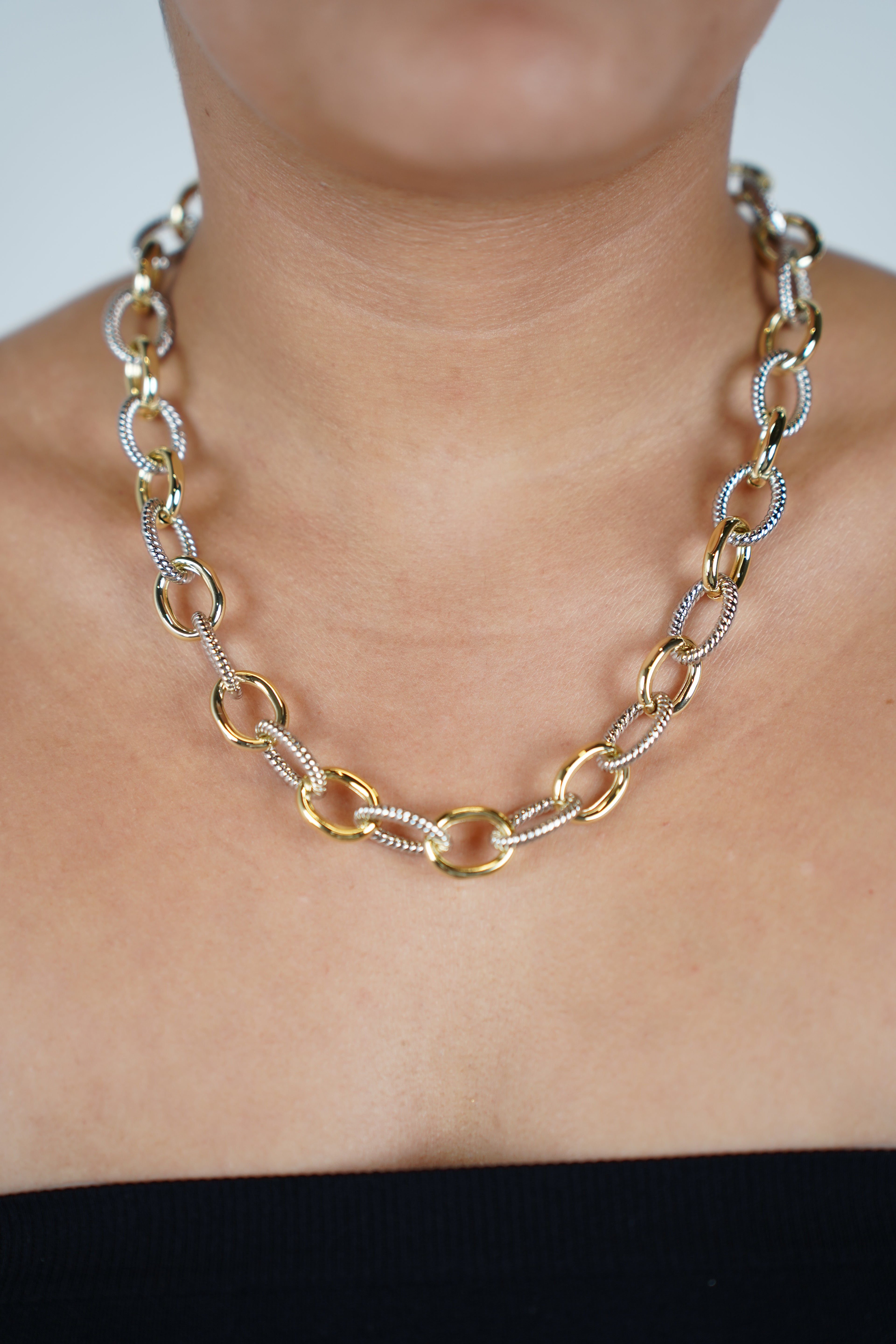 A bold and modern chain necklace featuring alternating gold and silver oval links for a stunning mixed-metal look.