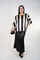 The Monica Striped Blouse is a modern statement top featuring bold vertical stripes, a silky satin finish, and a relaxed draped silhouette for elevated everyday styling.
