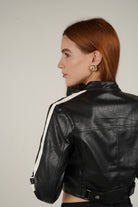Black Faux Leather Motor Jacket with White Stripe | Carema Boutique