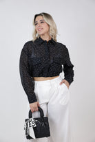 Shop the Naelle Sheer Polka Dot Top—lightweight, sheer, cropped, and chic with front pockets and polka-dot detailing. Perfect for day or night styling.
