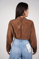 Woman wearing a brown sheer polka-dot cropped button-down top with front pockets.