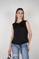 Shop the Negri Blouse at Carema Boutique. Black sleeveless blouse with gathered neckline and adjustable drawstring hem. Perfect for casual or chic looks.