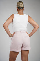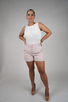 Alt text: Woman wearing tailored blush pink cuffed shorts with pockets and a white tank top.