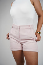 SEO Meta Description: Shop the Nela Shorts in blush pink, mint green, and light blue. These polished high-waisted shorts feature a cuffed hem and structured fit—perfect for spring and summer looks.