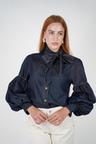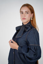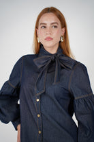 Model wearing the Nirame Denim Button Down featuring a bow necktie and puffed sleeves in a dark-wash denim.