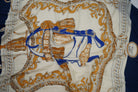 Meta Description: Add timeless elegance with the Norel Scarf, featuring a bold equestrian print in navy, gold, and ivory. Style as a wrap, headscarf, or accessory. Shop Carema Boutique.