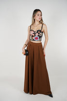 Brown high-waist palazzo pants with pleats, styled with a floral embroidered corset top.