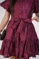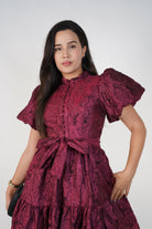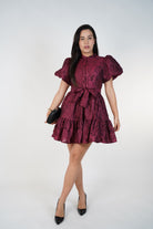“Nyselle Puff Sleeve Mini Dress in burgundy jacquard with floral texture and waist tie.”