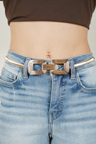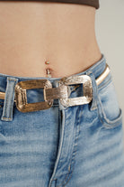 A statement elastic belt featuring a bold oblong metal buckle that cinches the waist while adding a modern, polished touch to any look.