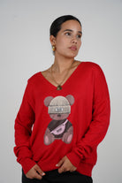 Meta Description: Bold meets cozy with the Odette V-Neck Sweater. Red knit with playful bear graphic and flattering neckline. A fun twist to everyday style.