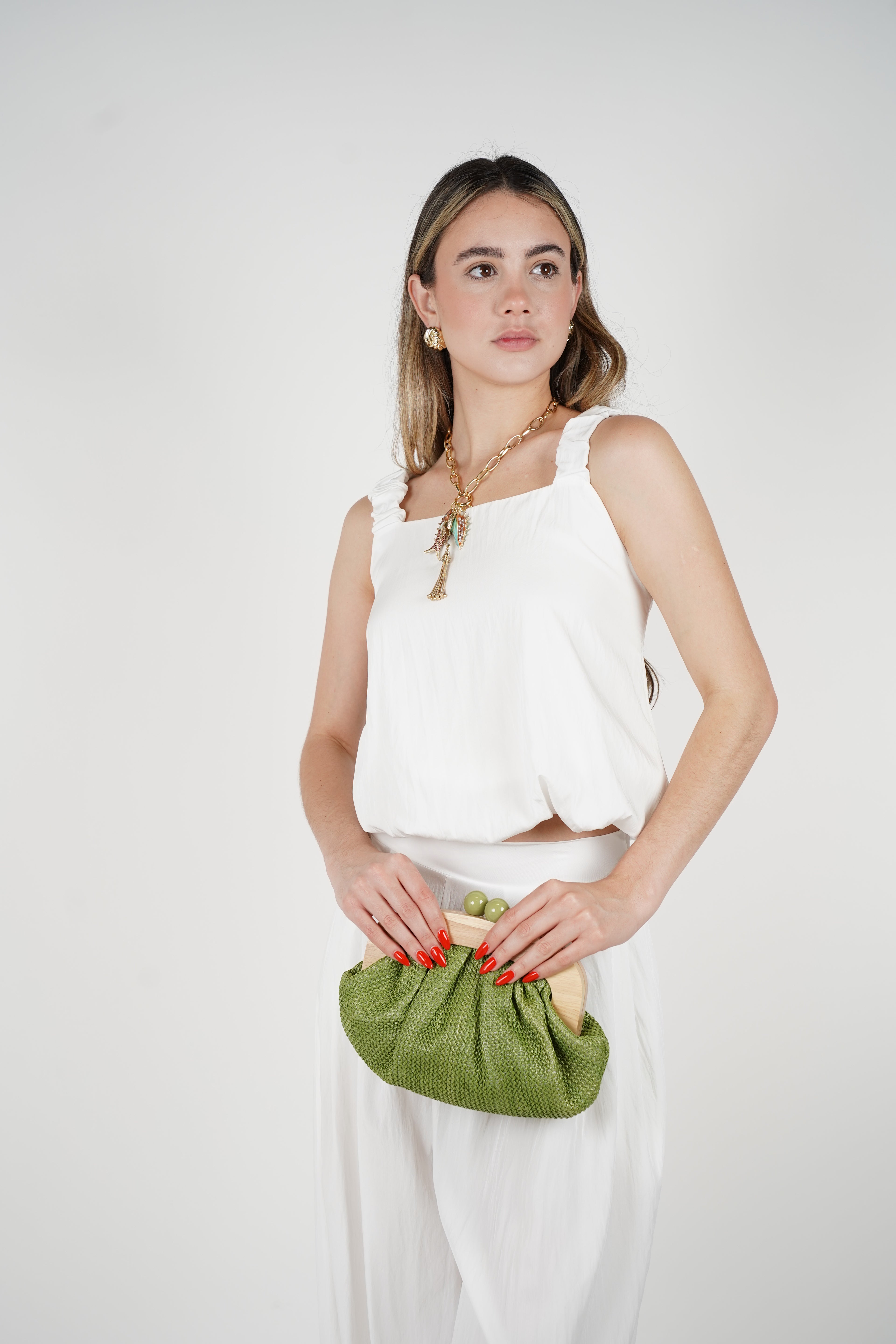 Model wearing navy two-piece jogger set with square-neck top and wide-leg elastic-cuff pants, accessorized with a cream clutch and wedge sandals.