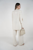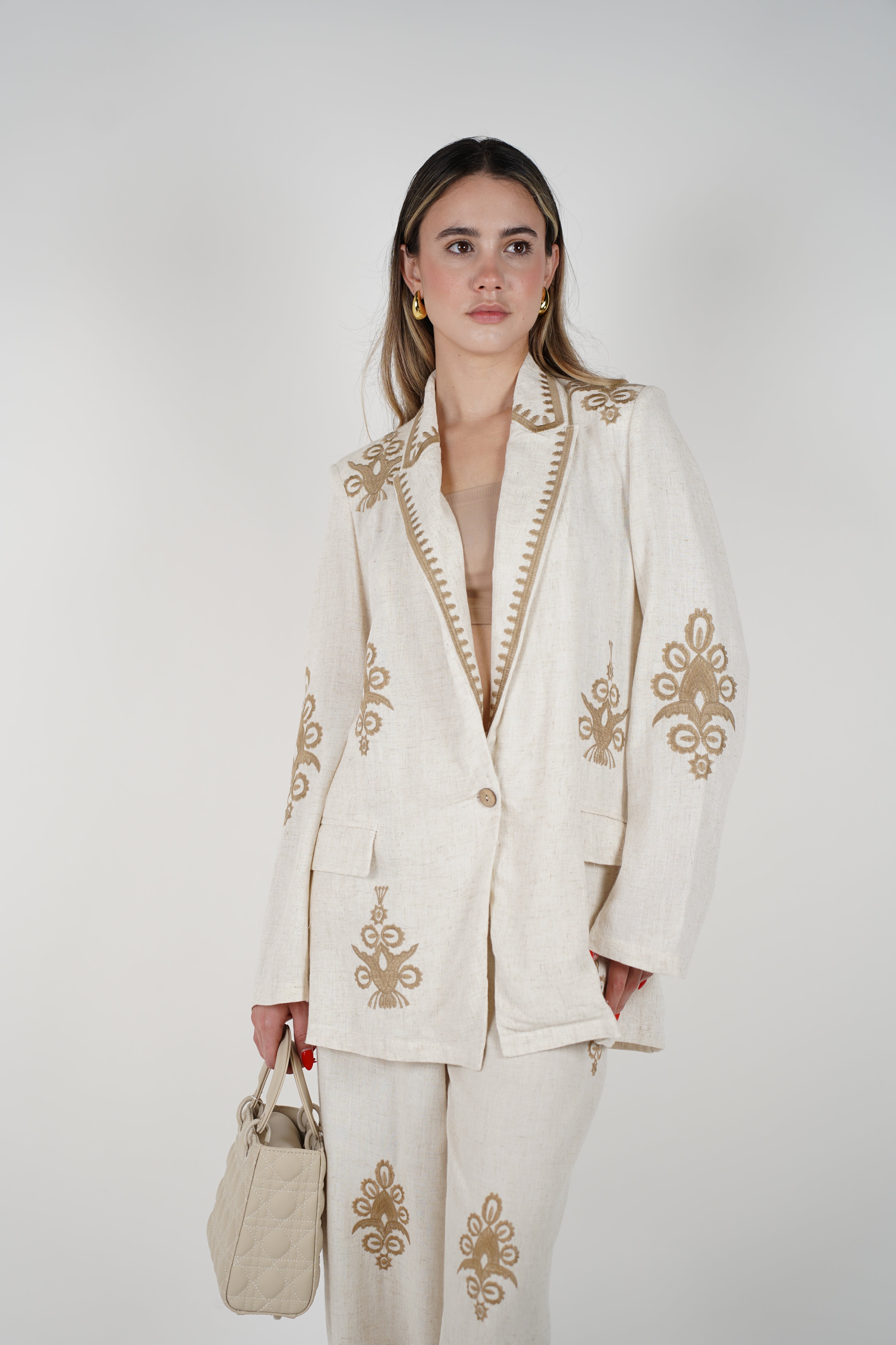 Neutral embroidered pants set with black detailing, featuring a tailored blazer and wide-leg trousers.