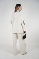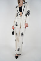 An elegant two-piece set featuring a tailored blazer and wide-leg pants, both adorned with bold black embroidery.