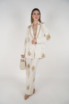 Meta Title: Raizza Embroidered Pants Set – Elegant Neutral Blazer and Trousers